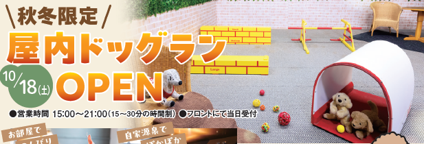 また、ご好評をいただいております、930㎡を誇る屋外ドックランや道内旅館初のナイトドックランは通年で営業しております。